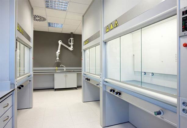 實驗室氣流組織,送、排風控制閥設置:有人操作時,通風柜調節門進風面風速始終為0.5m/s±20%。無人操作時為0.3m/s。在通風柜調節門關閉時,應保證通風柜保持適當的最小排風量,一般為額定風量的20%,通風柜下部有試劑柜時,試劑柜排風量約75m3/h。實驗室內萬向排風罩排風匯總管裝定風量閥,保證萬向排風罩排風量。