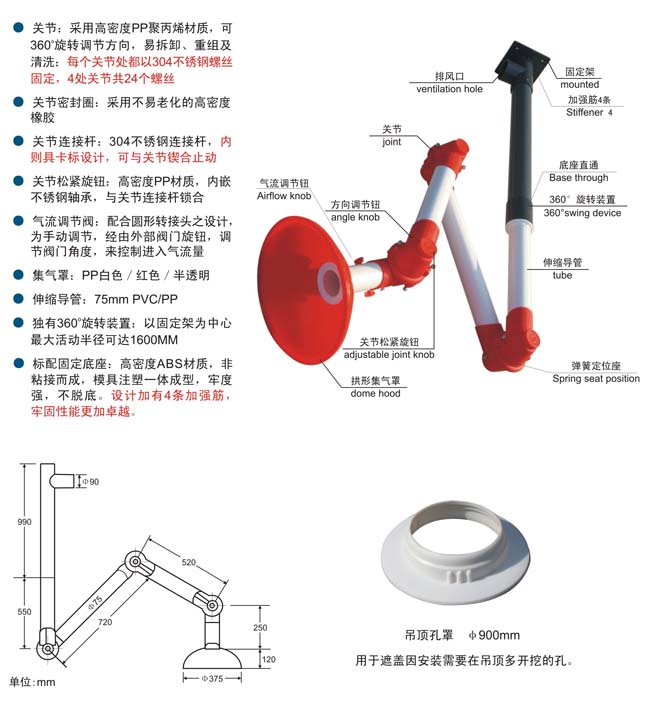 四段式伸縮導管尺寸:管徑∮:Dn.75mm Dn.90mm,Dn.110mm總長度四段式1500mm; 材質導管:pp圓管(聚丙烯材質); 旋轉關節pp:關節中心連結桿、支撐彈簧,鍍鋅處理之鋼材;關節接合墊圈,低摩擦處理環型橡膠墊圈; 并節松緊旋鈕pp:節氣蝶閥,塑料(外緣經軟質處理)。 本產品需和風機或通風系統配套使用 可根據客戶需求定制
