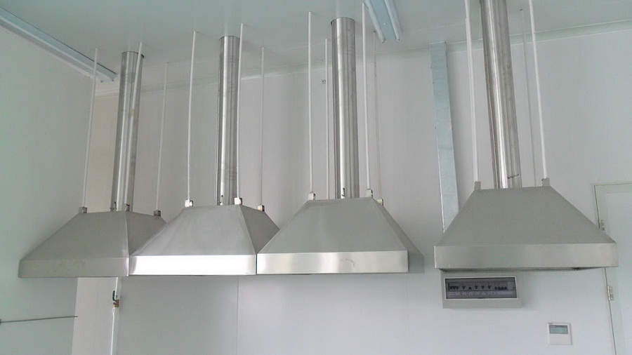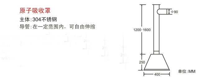 原子集氣罩:采用1.0MM厚不銹鋼板折彎、沖壓而成,安裝用支架固定于屋頂天花上,并和PVC排氣管連接; 導風管下方設置手動可調(diào)節(jié)風閥,調(diào)節(jié)范圍0-90;出風口為φ158, 本產(chǎn)品需和風機或通風系統(tǒng)配套使用。